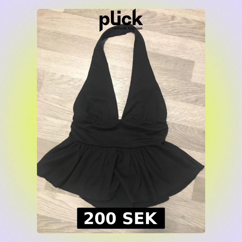 Säljer en svart topp från ZARA med djup v-ringning och bar rygg. Toppen har en markerad midja och volang nedtill för en snygg siluett. Perfekt att styla till jeans eller kjol för en trendig look.Strl M.