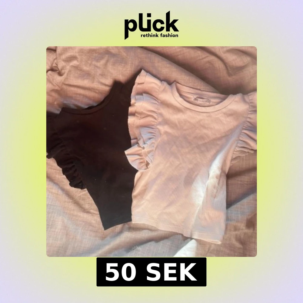 Två ribbade toppar från Zara i storlek S, en svart och en vit. Båda har korta ärmar med breda volanger som ger en extra cool touch. Materialet är mjukt och stretchigt, perfekt för att lyfta din outfit med lite statement-ärmar.