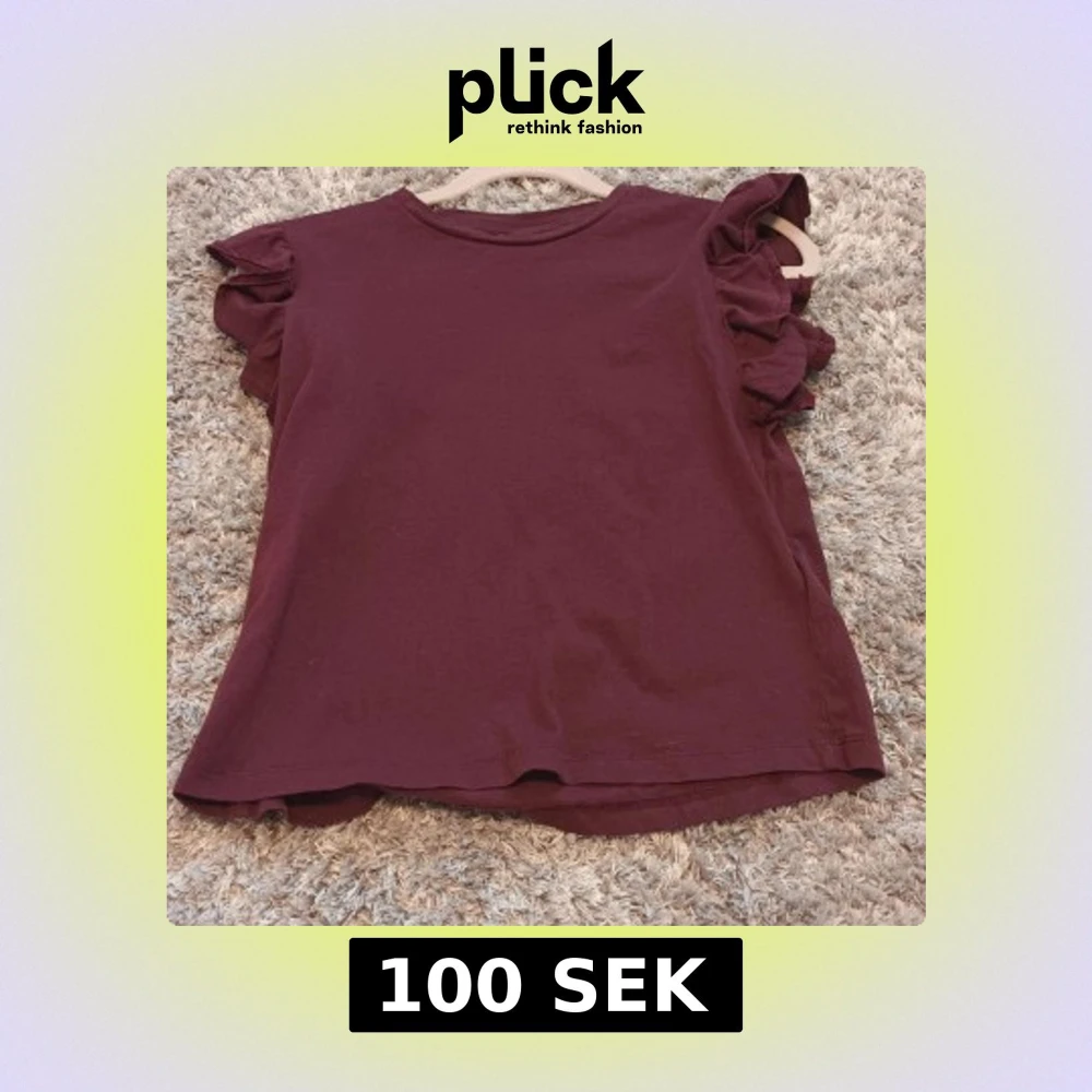 Säljer en vinröd topp från Gina Tricot med snygga volangdetaljer på ärmarna. Storlek 146/152. Den är knappt använd, endast 1 gång.