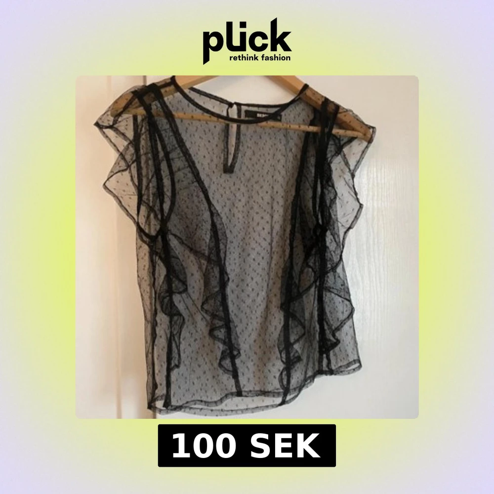 Säljer en svart transparent blus från Bik Bok i mesh med små prickar och volangdetaljer längs framsidan. Blusen är ärmlös och har en lätt och luftig känsla, perfekt för att skapa en cool och trendig look.