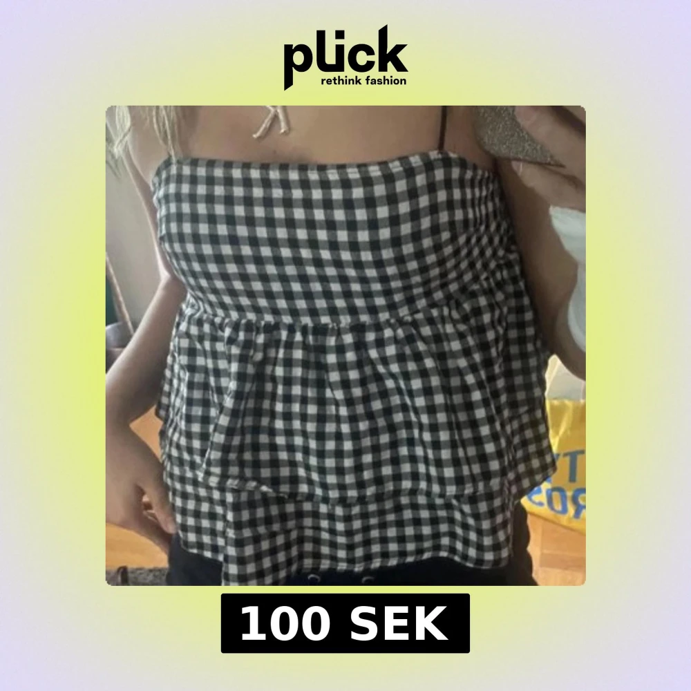Supersöt linnetopp med volanger, smala axelband och svartvitt rutigt mönster.