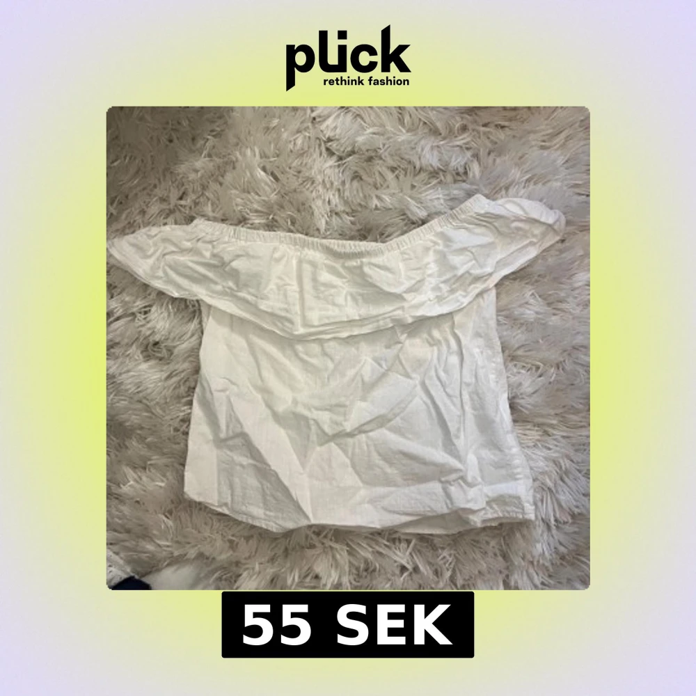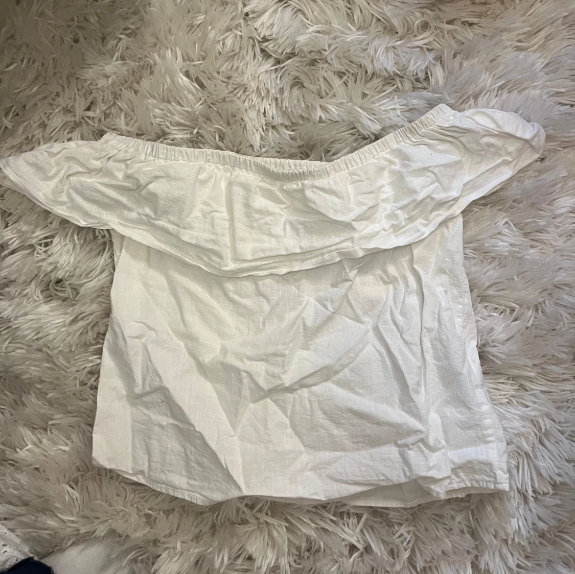 Säljer en vit offshoulder topp med bred volangkant runt axlarna. Toppen är ärmlös och har en luftig passform, perfekt för varma dagar. Enkel och stilren design som är lätt att matcha med olika outfits.
