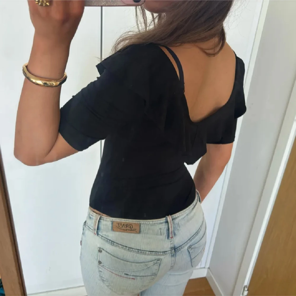 Så snygg och trendig trekvartsärmad vringad volangbody ! Jag är 168 och det är mina bilder, köp via köp nu direkt eller Swish, kvar tills markerad som såld 💖