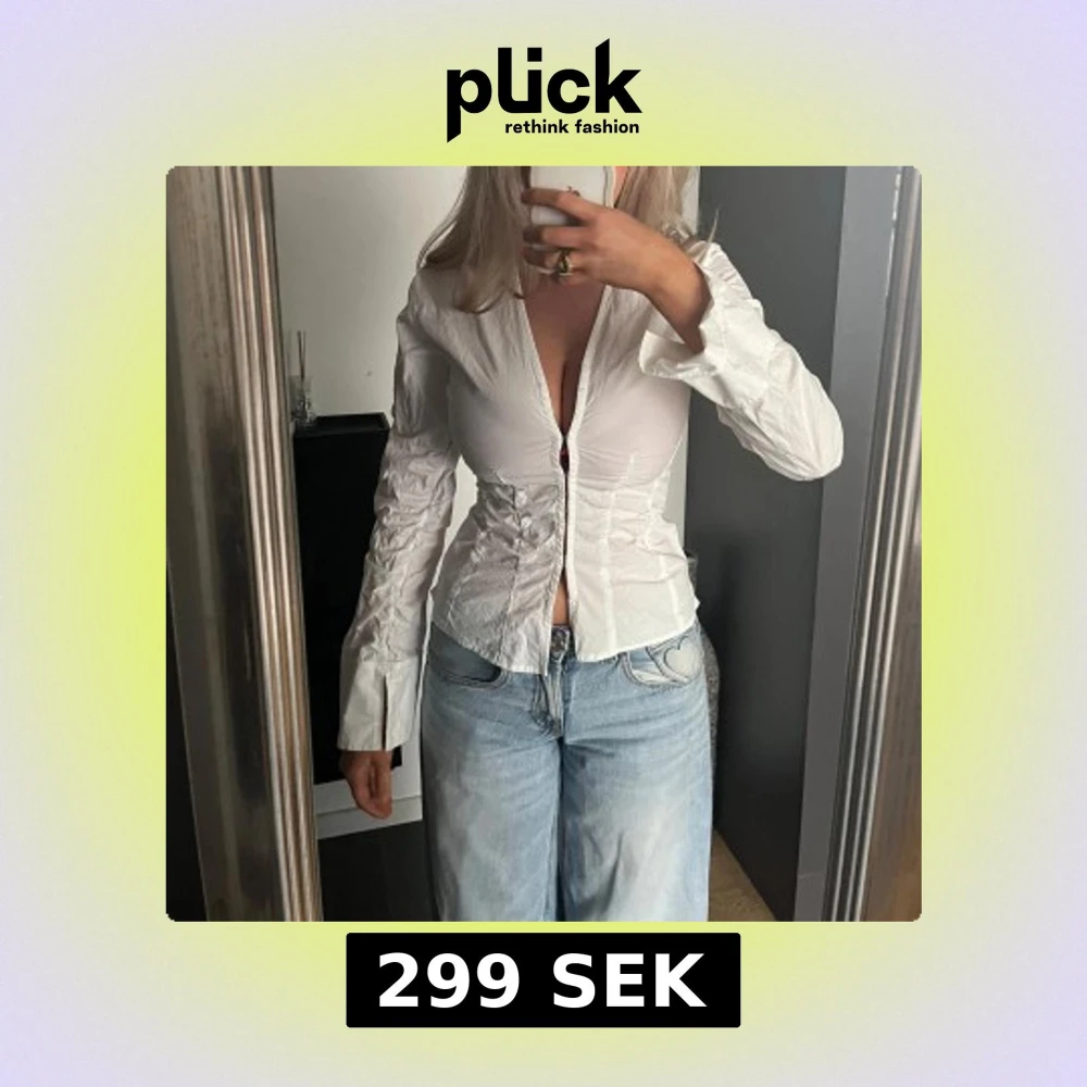 Säljer en vit v-ringad blus med dragkedja framtill och markerad midja. Blusen har långa ärmar med breda manschetter och en figurnära passform. Storlek XS 🌸