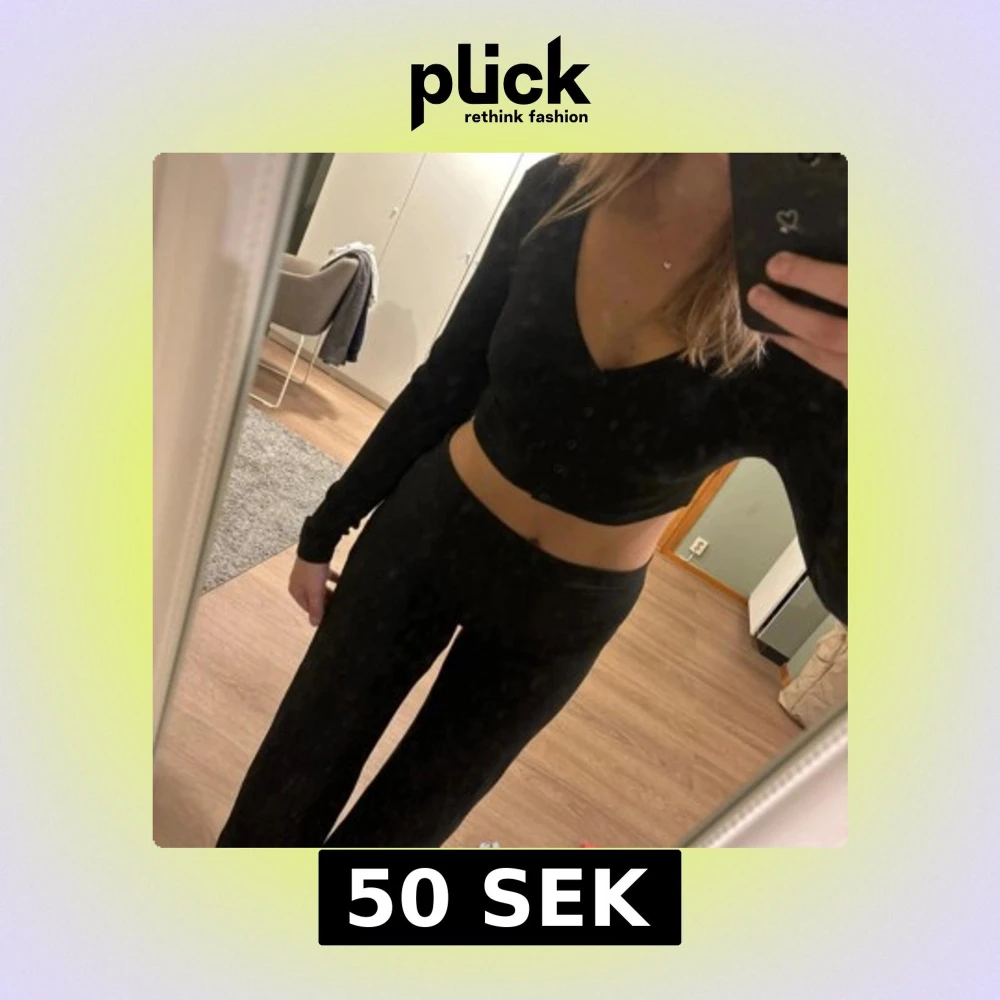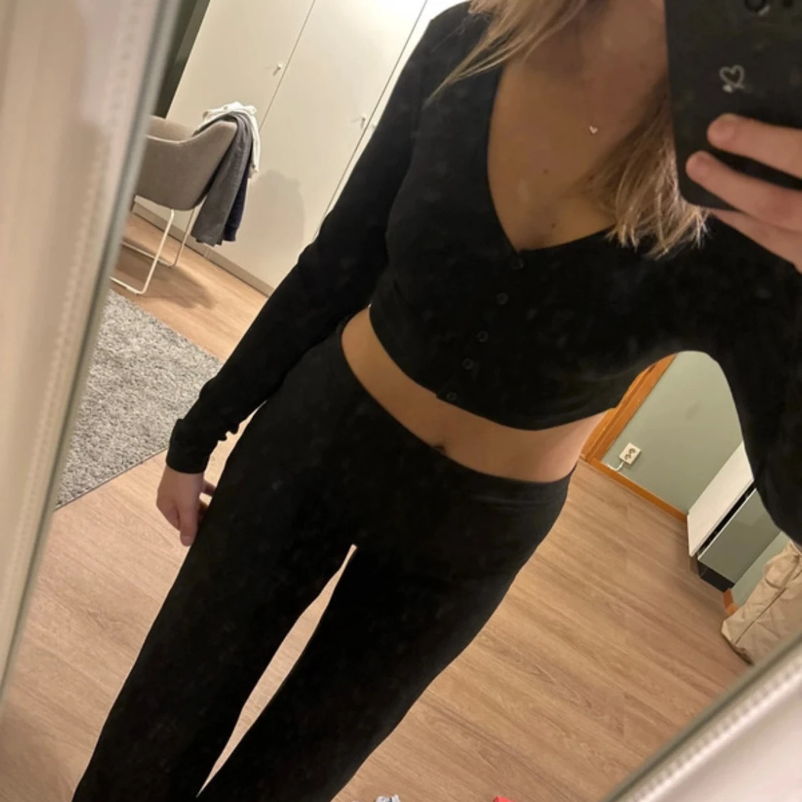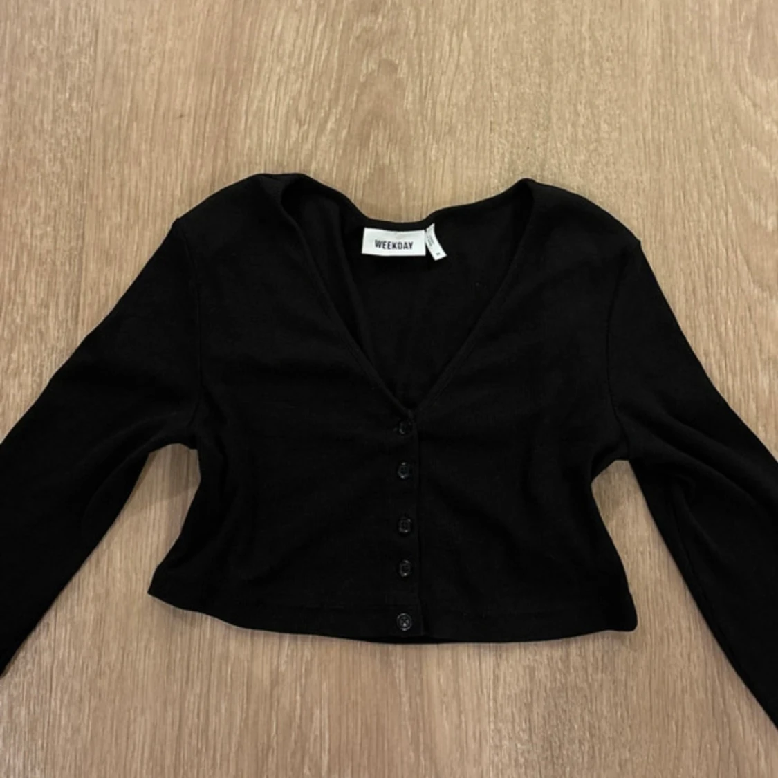 Säljer en svart croppad topp från Weekday med lång ärm och v-ringad hals. Toppen har knappar framtill och är gjord i mjuk bomull. Använd 2-3 gånger💓 Storlek S/M