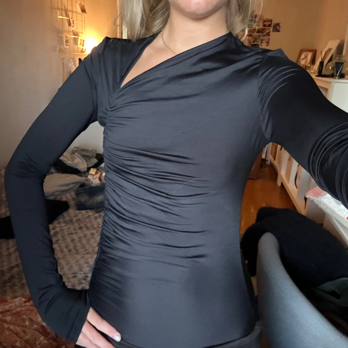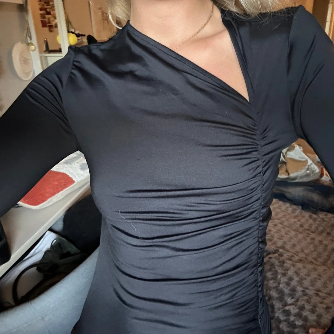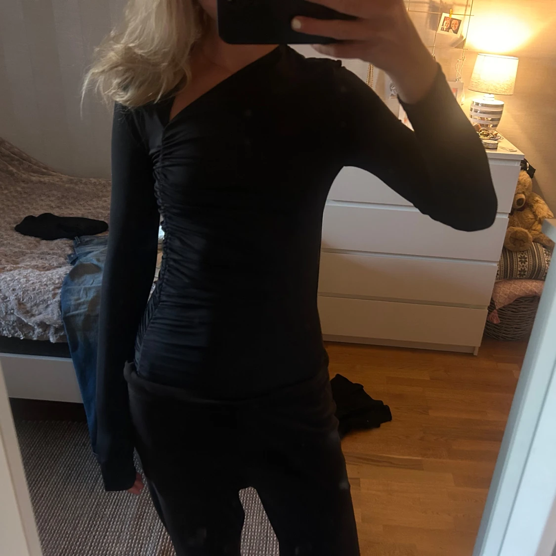 Säljer en supersnygg svart långärmad topp med omlott-skärning och snygga rynkade detaljer längs sidan. Super bra skick!
