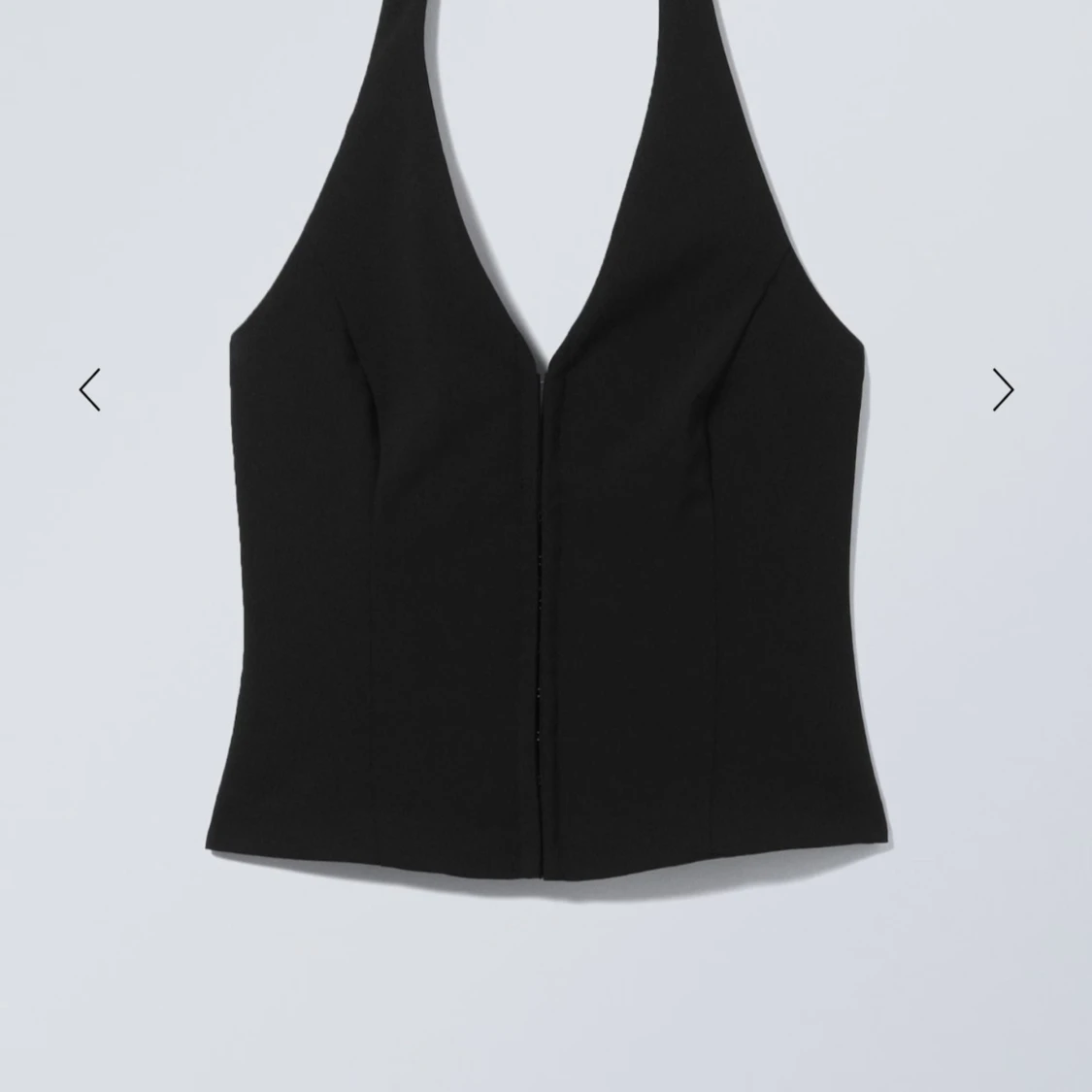 Snygg svart korsett-topp med djup v-ringning och halterneck. Toppen har krokar framtill för stängning och en figurnära passform som framhäver siluetten. Perfekt för dig som vill ha en stilren och edgy look. Skriv privat för mer bilder. Helt ny ej använd