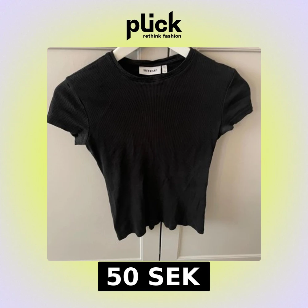 En svart, ribbad topp från Weekday med korta ärmar och rund hals. Modellen är tight och croppad, perfekt att styla med jeans eller kjol. Enkel och stilren design som funkar till många olika looks.