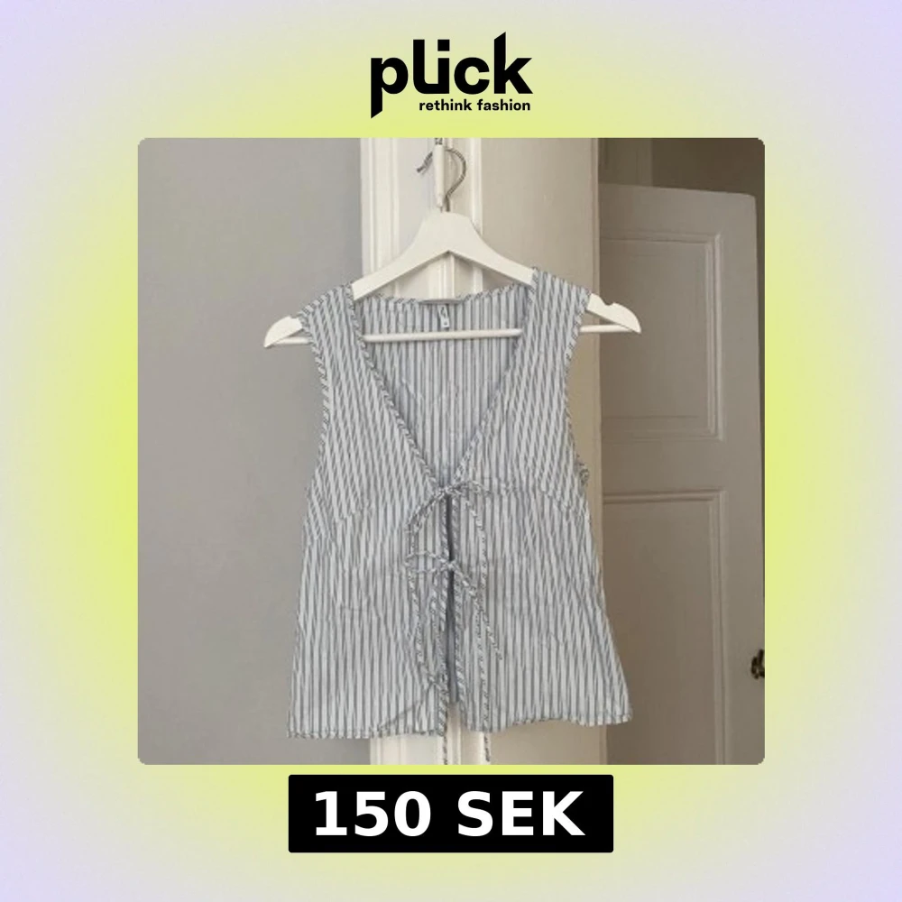 Säljer en snygg topp från Weekday i vitt med tunna svarta ränder. Toppen har djup v-ringning och knyt framtill med tre band.