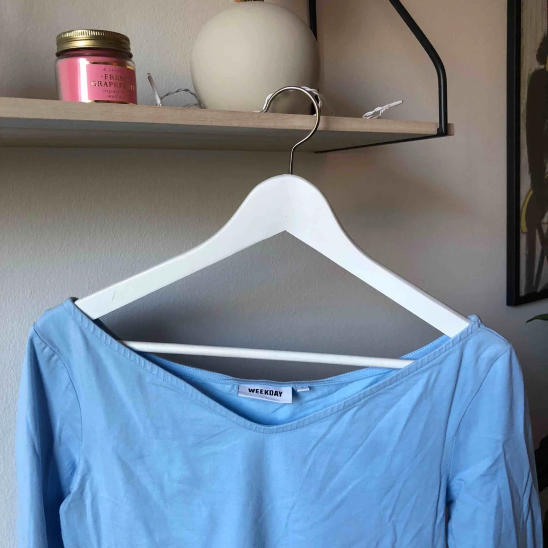 Ljusblå långärmad tröja från Weekday med bred urringning. Nästintill aldrig använd. Frakt tillkommer <3