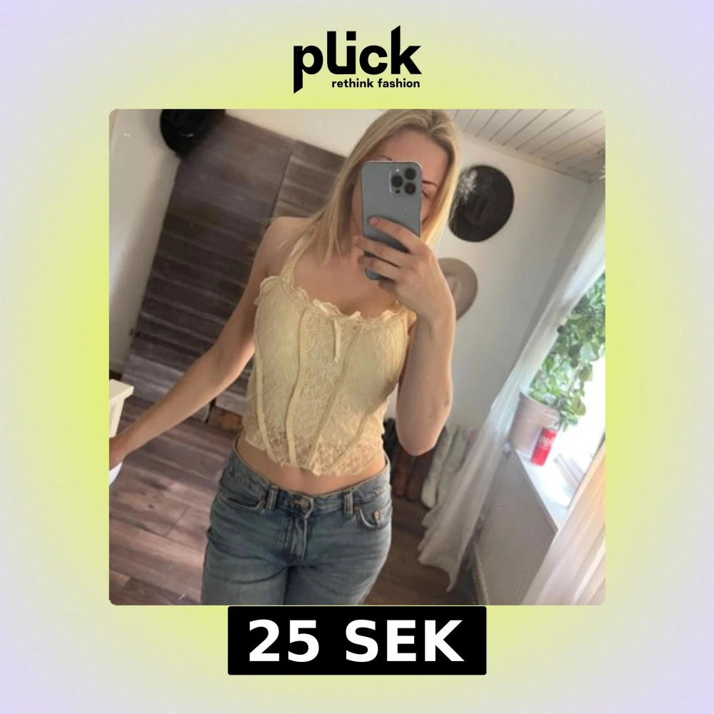 Säljer en beige korsett-topp i spets med smala axelband och söt rosettdetalj framtill. Toppen är croppad och har en feminin, figurnära passform med dekorativa sömmar som ger en snygg siluett. Perfekt för dig som gillar romantisk och trendig stil. Mjukt material.