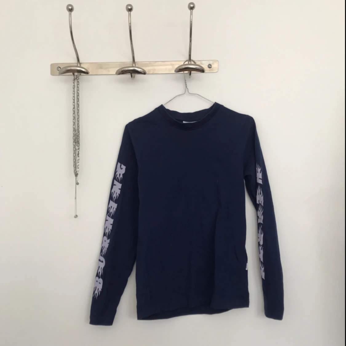 Mörkblå långärmad tröja med text på ärmarna från WEZC, använd fåtal gånger, riktigt fint skick! Köptes för ca 500kr