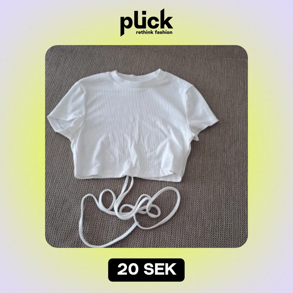 En vit ribbad croppad topp med korta ärmar och rund hals. Toppen har en knytning i midjan för en justerbar passform.