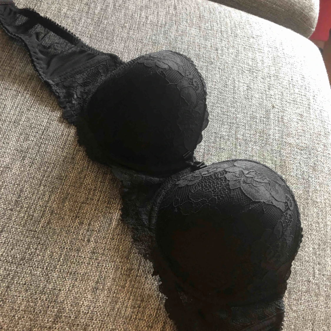 Svart bandlös spets bh från England, aldrig använd (klippt av banden så den är perfekt att ha under offshoulder tex). Älskar att den har breda band, sitter bra på!