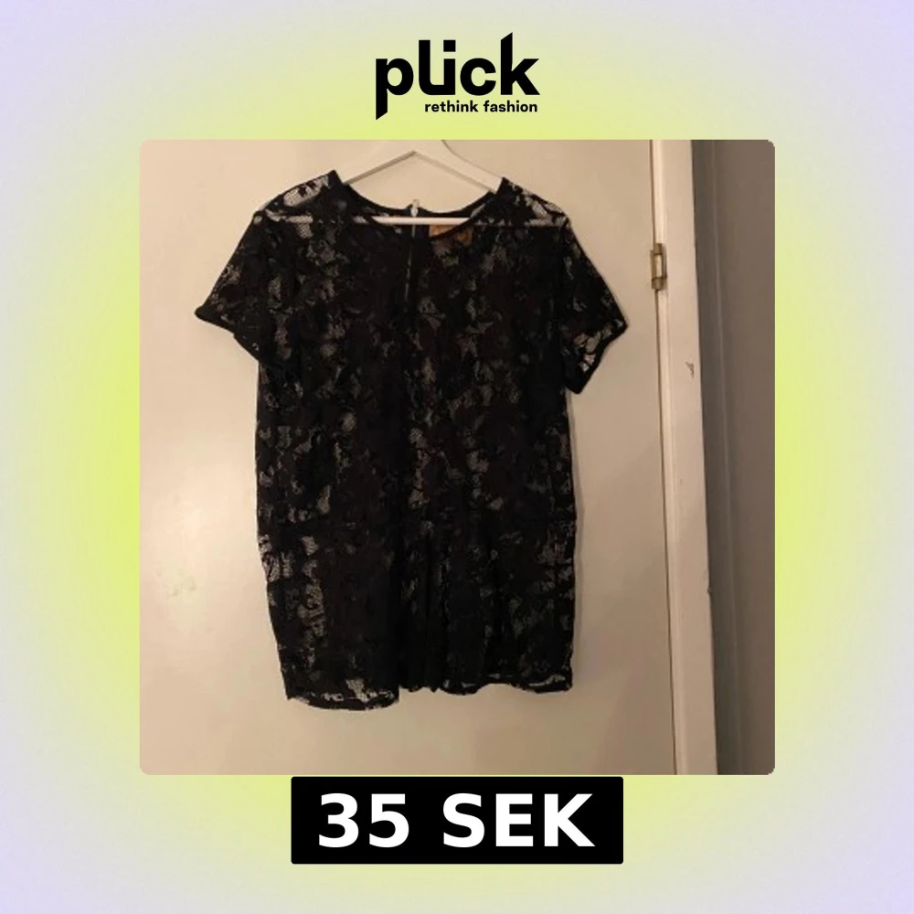 Svart blus i genombruten spets med blommigt mönster och korta ärmar. Toppen har rund halsringning och en synlig dragkedja bak. Perfekt för dig som gillar detaljer och vill ha en snygg och stilren look.