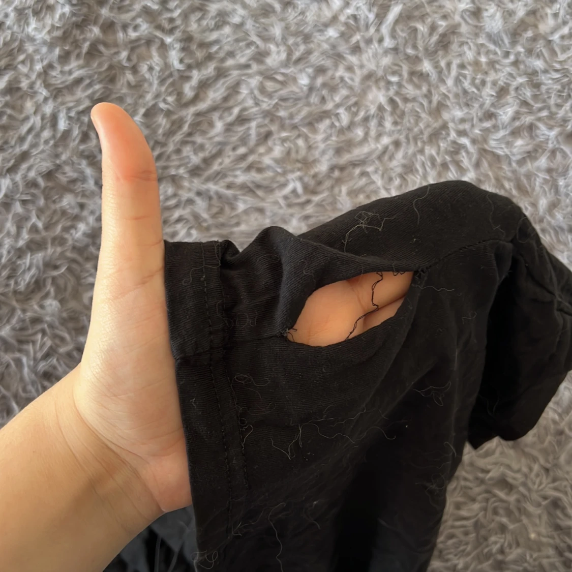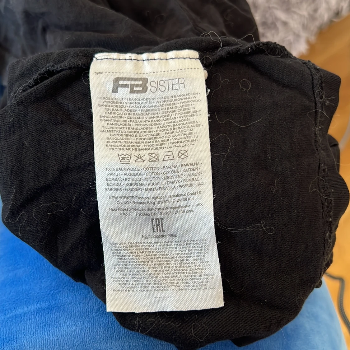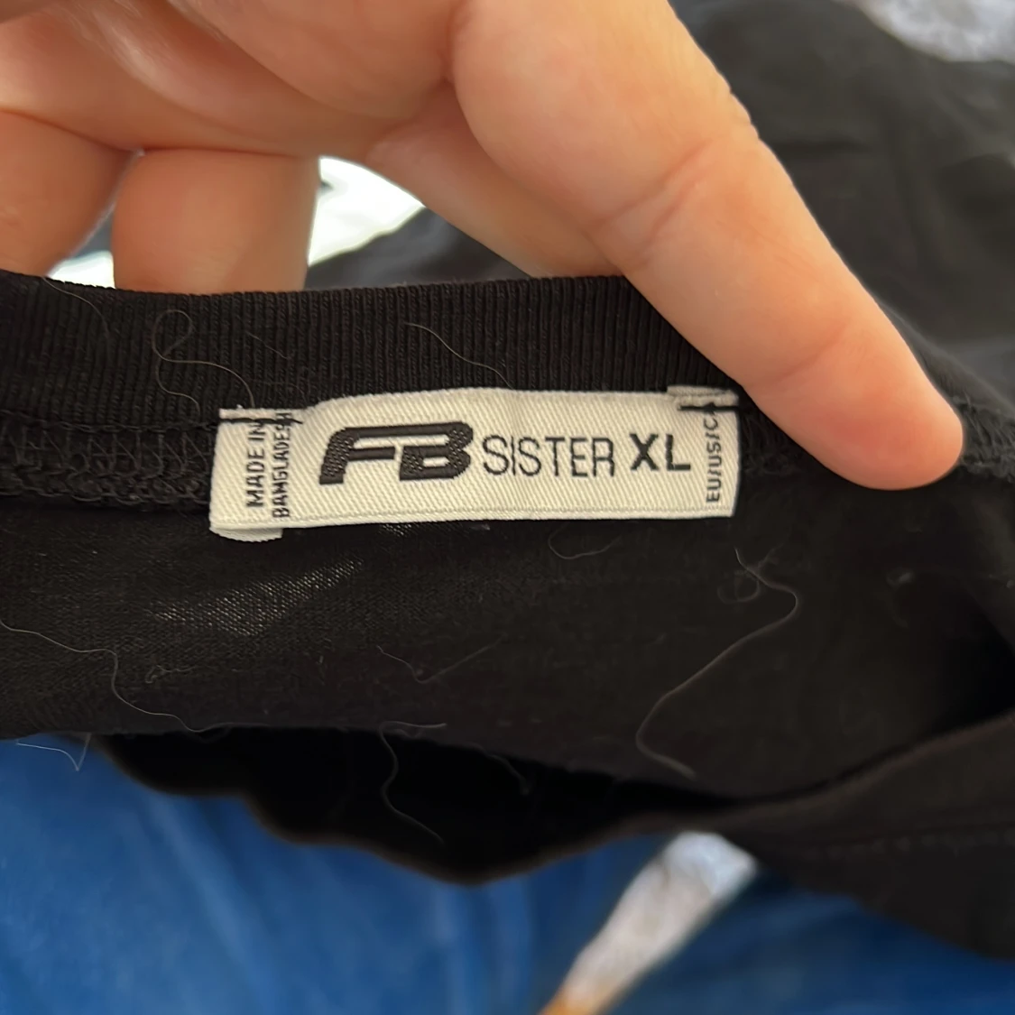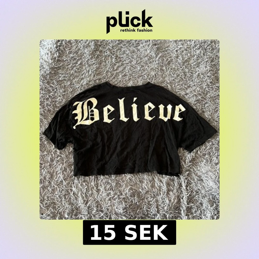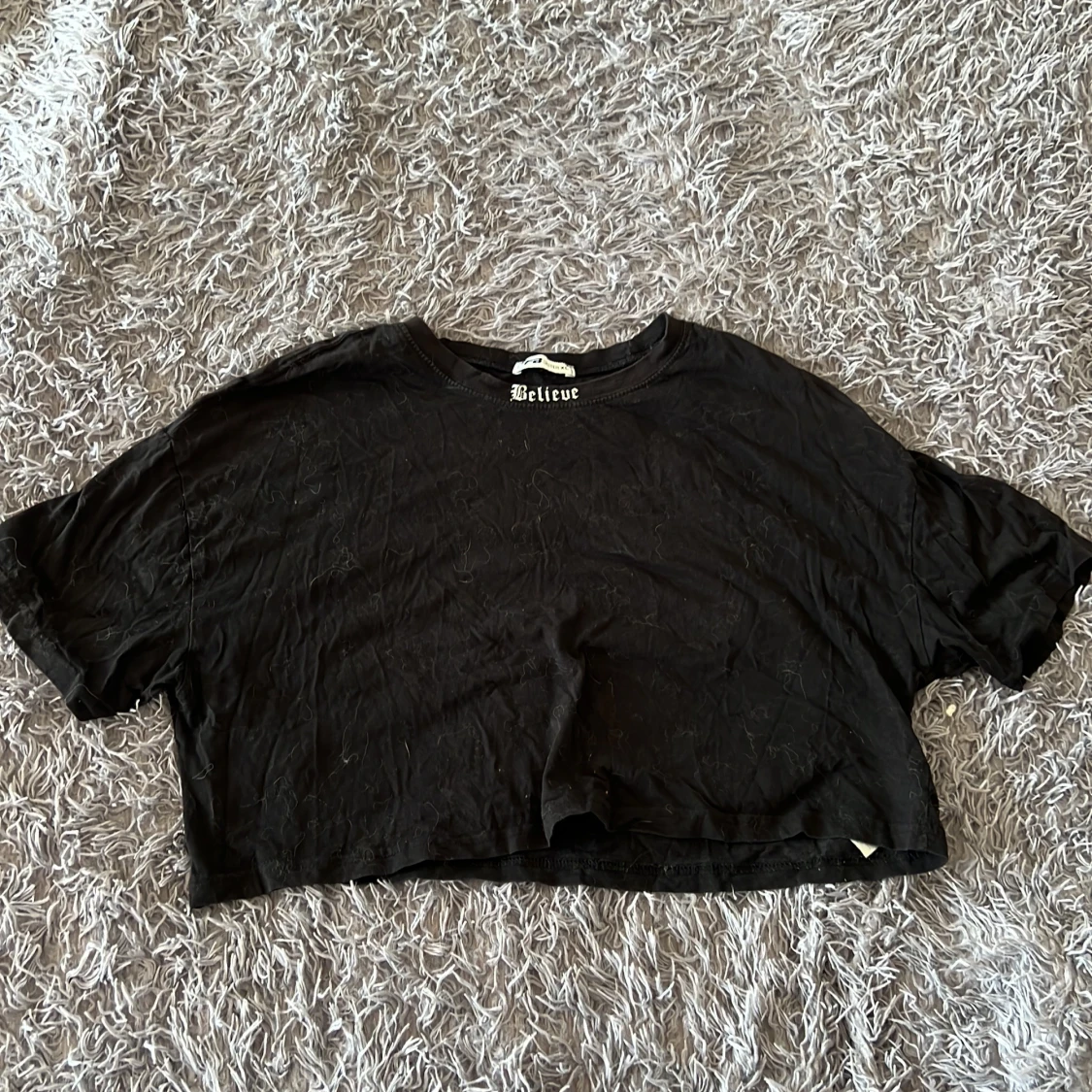 Cool svart croppad t-shirt från FB Sister i bomull. Stor text 'Believe' i vit gotisk stil på ryggen. T-shirten har korta ärmar och avslappnad passform, perfekt för en edgy streetstyle-look. Den har ett hål under höger arm (se bilden)