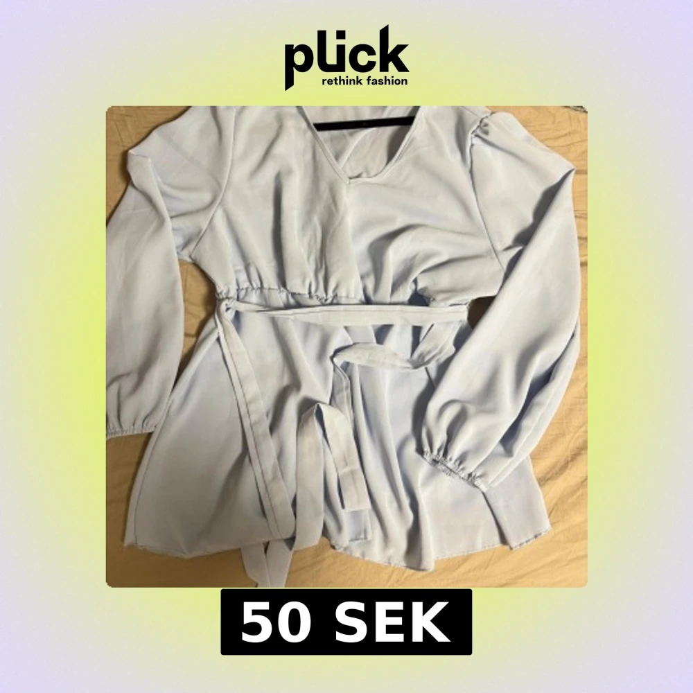Supersöt ljusblå blus med omlottkänsla och knytband i midjan. Blusen har v-ringning, långa puffiga ärmar med resår vid handlederna och ett flowy fall. Perfekt för dig som gillar en feminin och luftig stil.