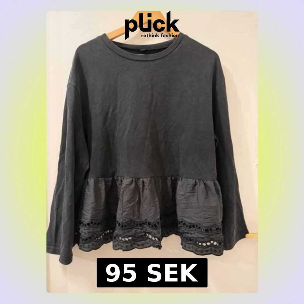 En svart grå blus med långärmad design och rund hals. Nederdelen har en volang med dekorativa spetsdetaljer som ger en cool och unik look. Perfekt för dig som gillar att sticka ut med snygga detaljer. Materialet känns som bomull upptill och syntet i volangen.