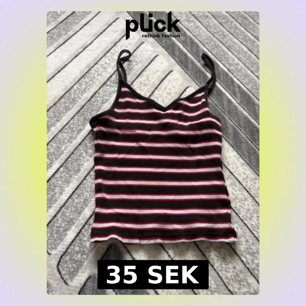 Säljer en ribbad linnetopp med smala axelband och v-ringning. Toppen har svarta, vita och rosa ränder och är croppad i modellen. Perfekt för dig som gillar en enkel men snygg stil.