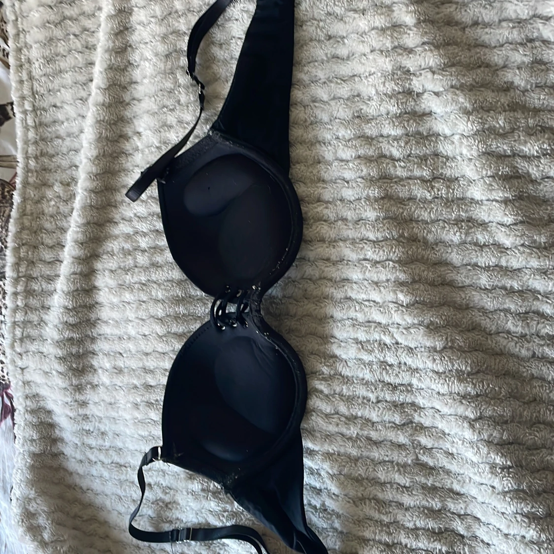 Säljer en svart korsett-topp med vadderade kupor och snygg snörning framtill. Axelbanden är justerbara och materialet är mjukt och följsamt, perfekt för att skapa en snygg siluett. Passar till många olika outfits och ger en cool vibe.