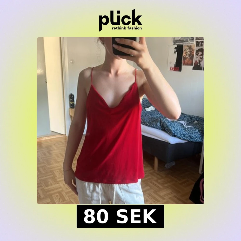 Säljer en röd linnetopp med tunna axelband och snygg draperad urringning. Toppen är ärmlös och har en loose passform som känns både chill och trendig. Perfekt att styla med jeans eller kjol för en cool look.