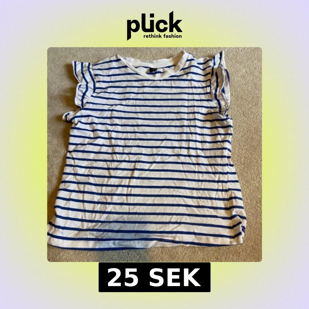 Säljer en söt randig topp med blå och vita ränder. Toppen har volangdetaljer vid ärmarna och en rund halsringning. Perfekt för en gullig sommar stil💞