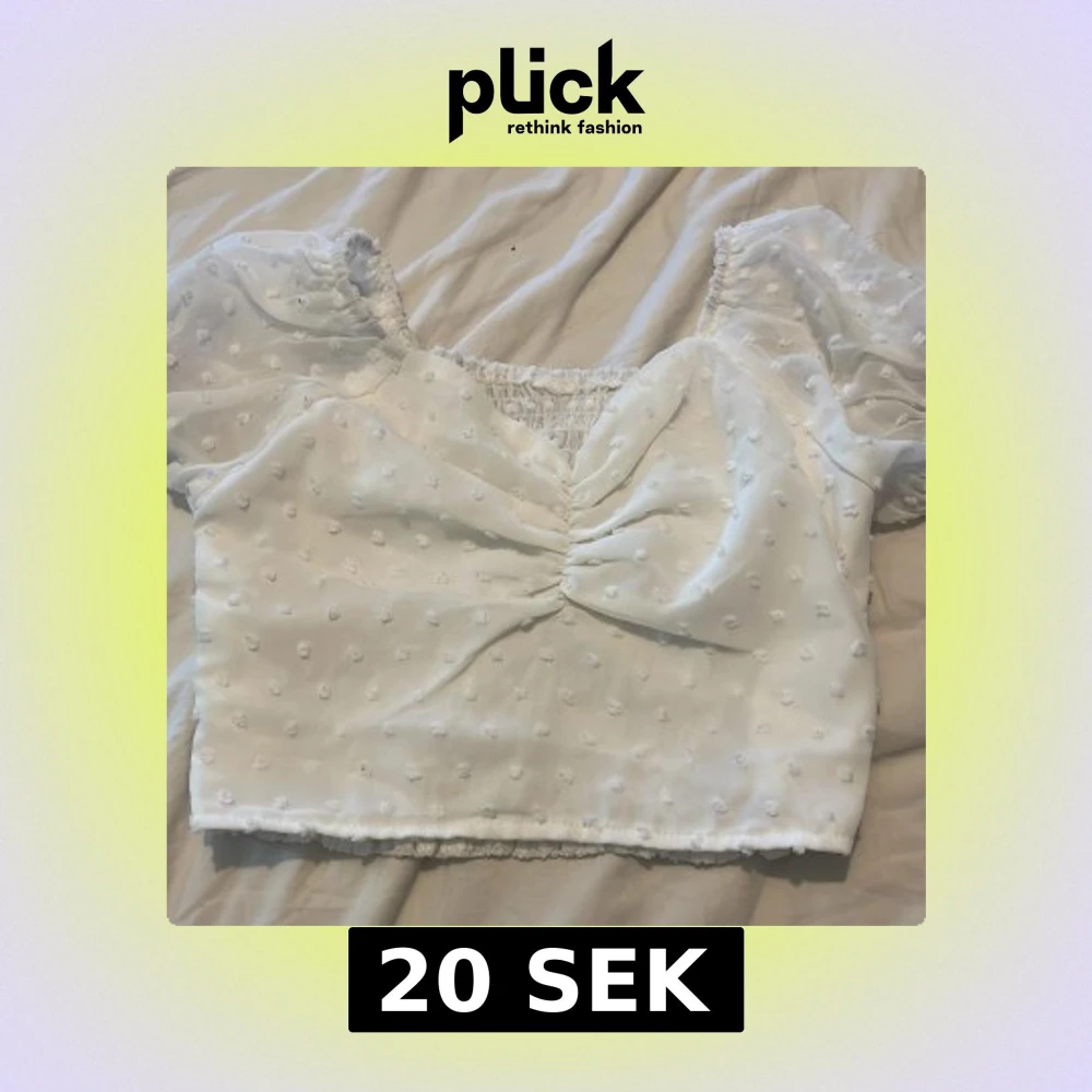 Superfin vit blus med croppad passform och puffiga korta ärmar. Tyget är lätt och har små broderade prickar över hela toppen. Söt rynkdetalj framtill och smockad rygg för extra komfort. Perfekt för en somrig look!