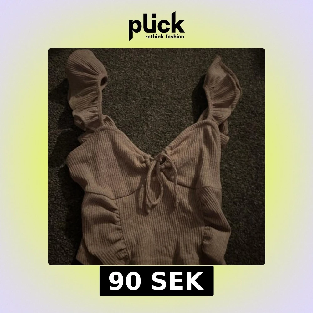 Säljer en beige ribbad topp med volangdetaljer på axelbanden och knytning framtill. Perfekt för en stilren och trendig look.