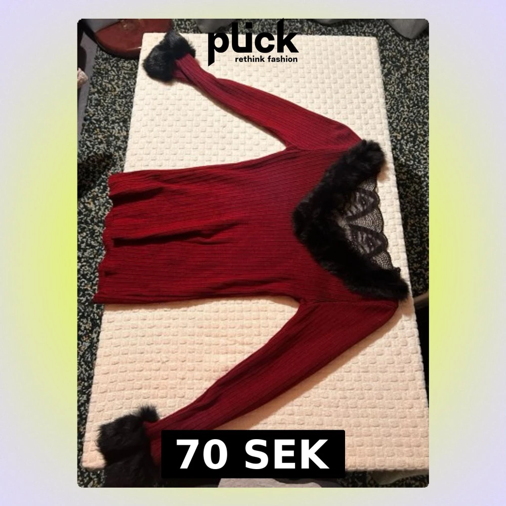 Säljer en vinröd ribbad topp med långärmade ärmar och svarta fuskpälsdetaljer vid ärmslut och halsringning. Toppen har spetsdetaljer vid halsen som ger en extra touch. Perfekt för dig som gillar unika detaljer och vill sticka ut.