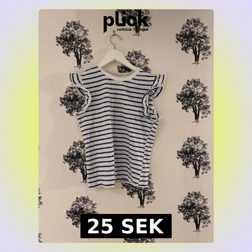 Säljer en vit och blå randig topp från SHEIN i storlek XS. Toppen har volangdetaljer vid ärmöppningarna och är ärmlös. Tillverkad i mjuk bomull, perfekt för en fräsch och avslappnad look. Klassisk rund halsringning och croppad passform.