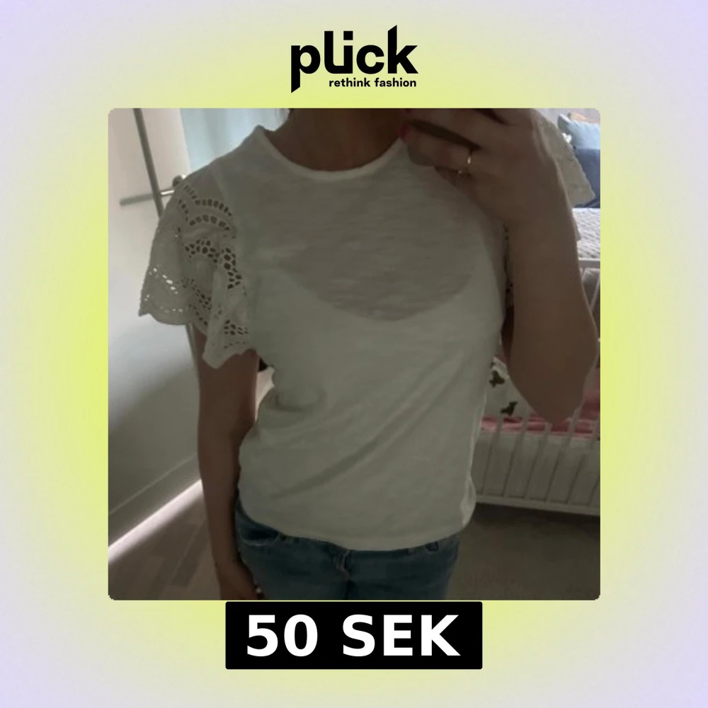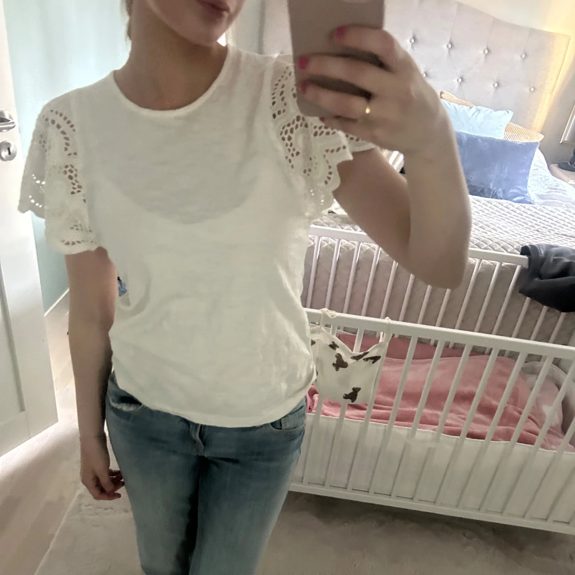 Säljer en söt vit topp med korta ärmar i spets och rund halsringning. Perfekt för dig som gillar romantiska detaljer och enkel stil. Toppen är i mjukt material och passar till både jeans och kjol.