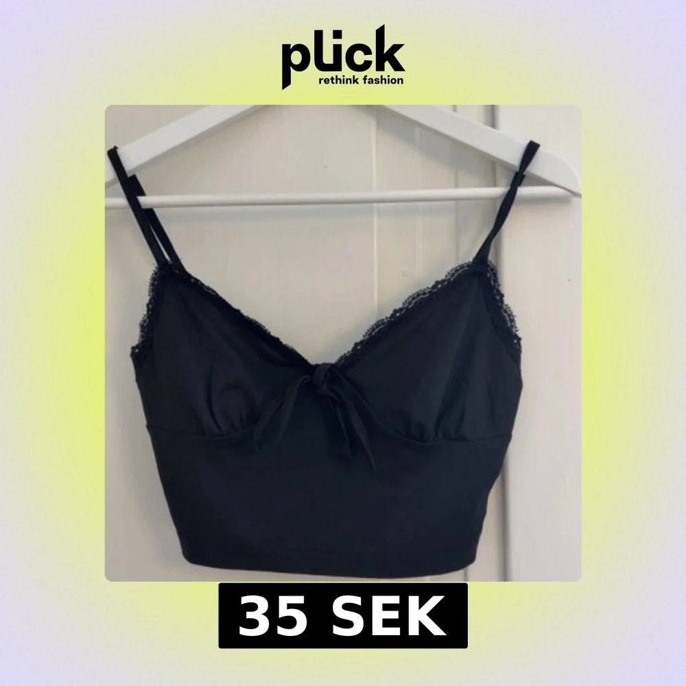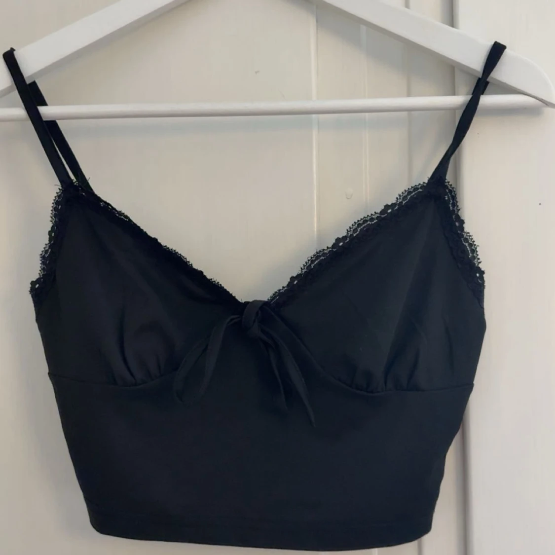 Snygg svart croppad linnetopp med tunna axelband, spetsdetaljer längs kanterna och en liten rosett framtill. Perfekt att styla med jeans eller kjol för en trendig look.