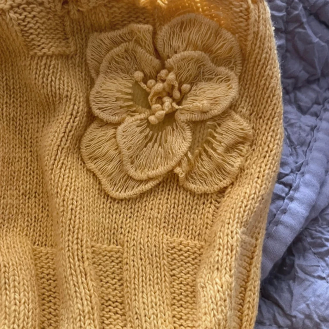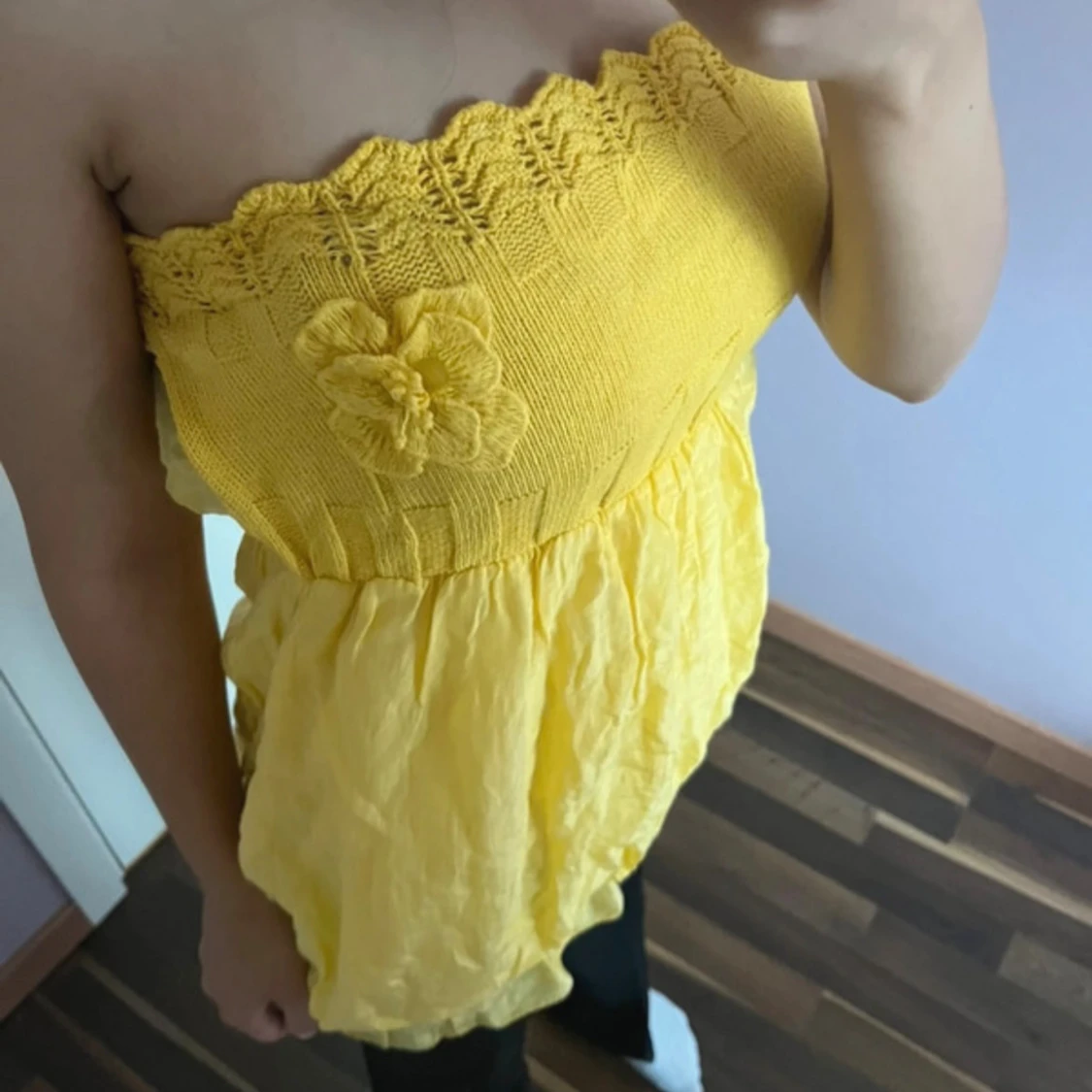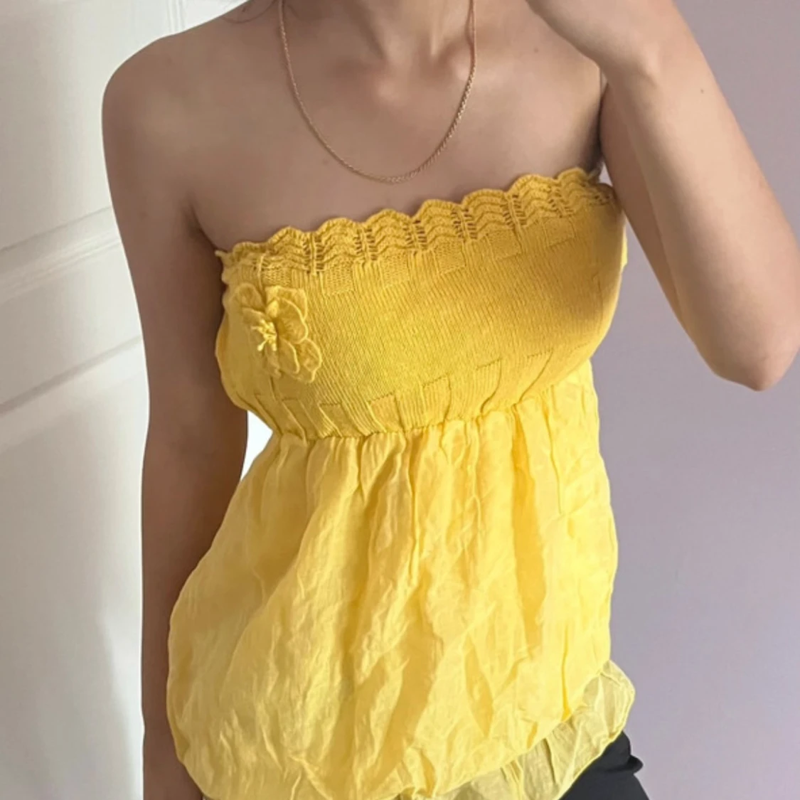 Säljer en söt gul bandeau tubtopp med stickad överdel och volangig, luftig nederdel. Toppen har en dekorativ stickad blomma framtill och vågig kant upptill. Perfekt för sommardagar och enkel att styla med jeans eller kjol.