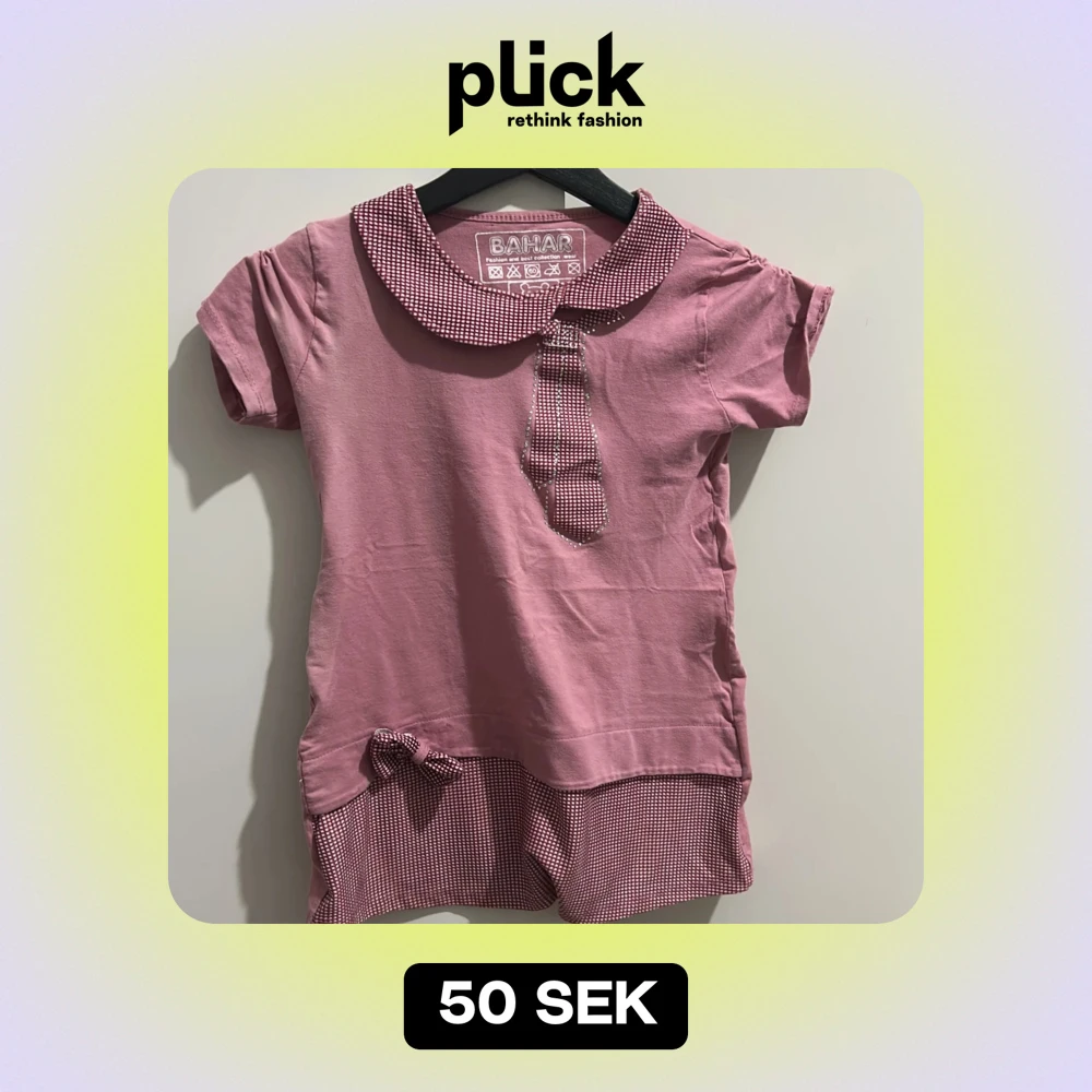 Söt rosa topp från Bahar med korta ärmar och ett rutigt mönster på kragen och nederkanten. Den har en dekorativ rosett och en knytning framtill. Perfekt för en avslappnad dag eller en somrig utflykt!
