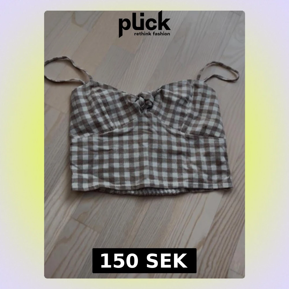 Säljer en croppad linnetopp med beige och vitt rutigt mönster. Toppen har tunna axelband, knyt framtill och smockad rygg för extra komfort. Perfekt för varma dagar och enkel att styla med jeans eller kjol.