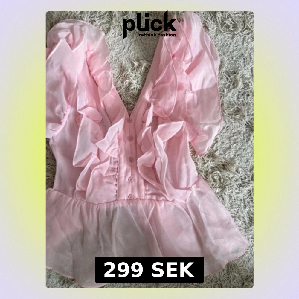 Supersöt ljusrosa blus med djup v-ringning, volanger framtill och puffiga korta ärmar. Blusen har knappar framtill och smock i ryggen för skön passform. Tillverkad i ett tunt, skirt material som ger en romantisk vibe.