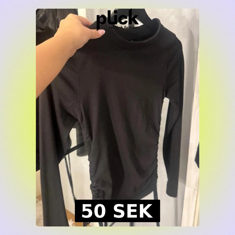 Snygg svart långärmad topp med hög hals och snörning i sidorna som ger en cool rynkad effekt.