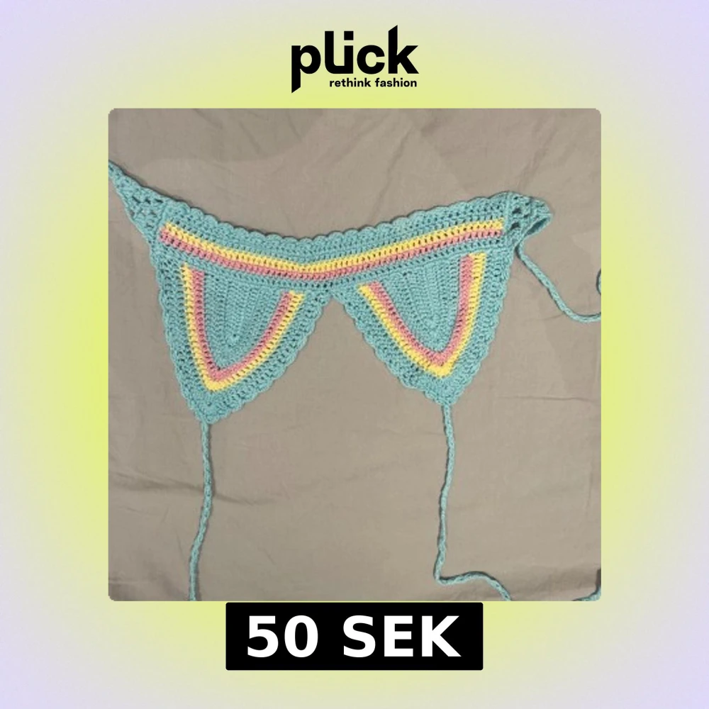 Superfin virkad topp med snörning i sidorna. Färgerna är ljusblå, ljusrosa och ljusgul i ett randigt mönster. Materialet känns mjukt och är stickat för en unik look.