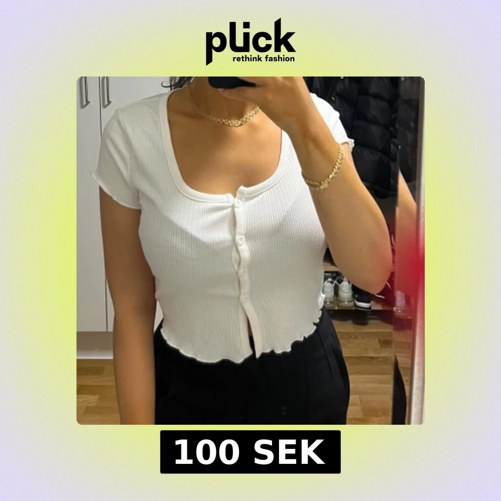 Säljer en vit croppad topp med korta ärmar och ribbad struktur. Toppen har en snygg v-ringning och knappar framtill samt vågig kant nedtill. Perfekt för dig som gillar stilrena och trendiga plagg.