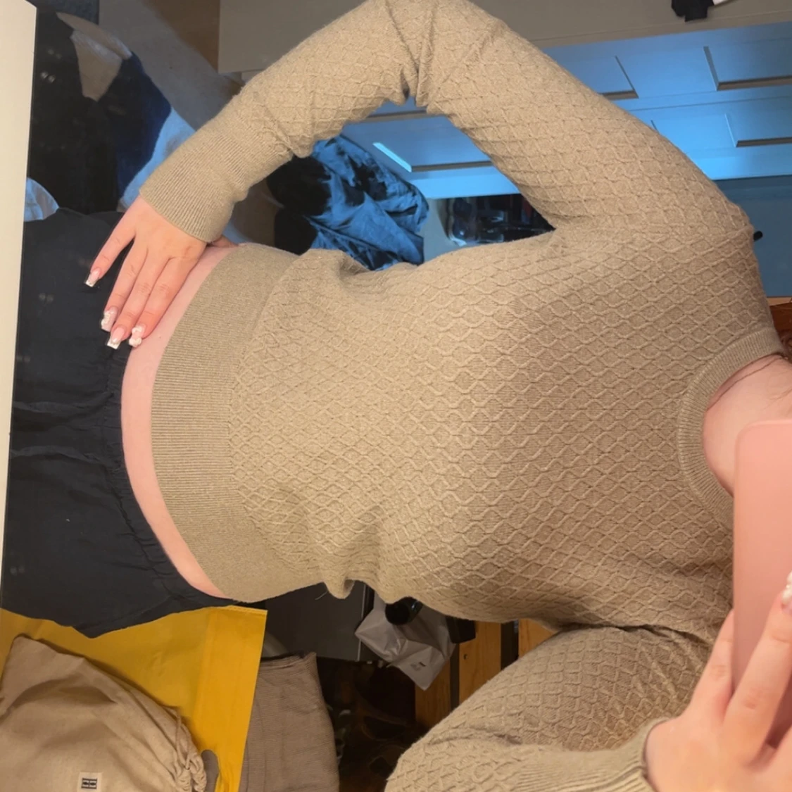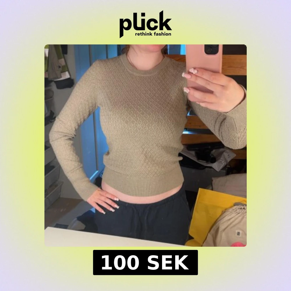 Säljer en beige stickad tröja med snyggt strukturmönster över hela plagget. Tröjan har rund halsringning, långa ärmar och bred mudd i midjan och vid ärmsluten. Perfekt för dig som gillar stilrena och bekväma plagg.