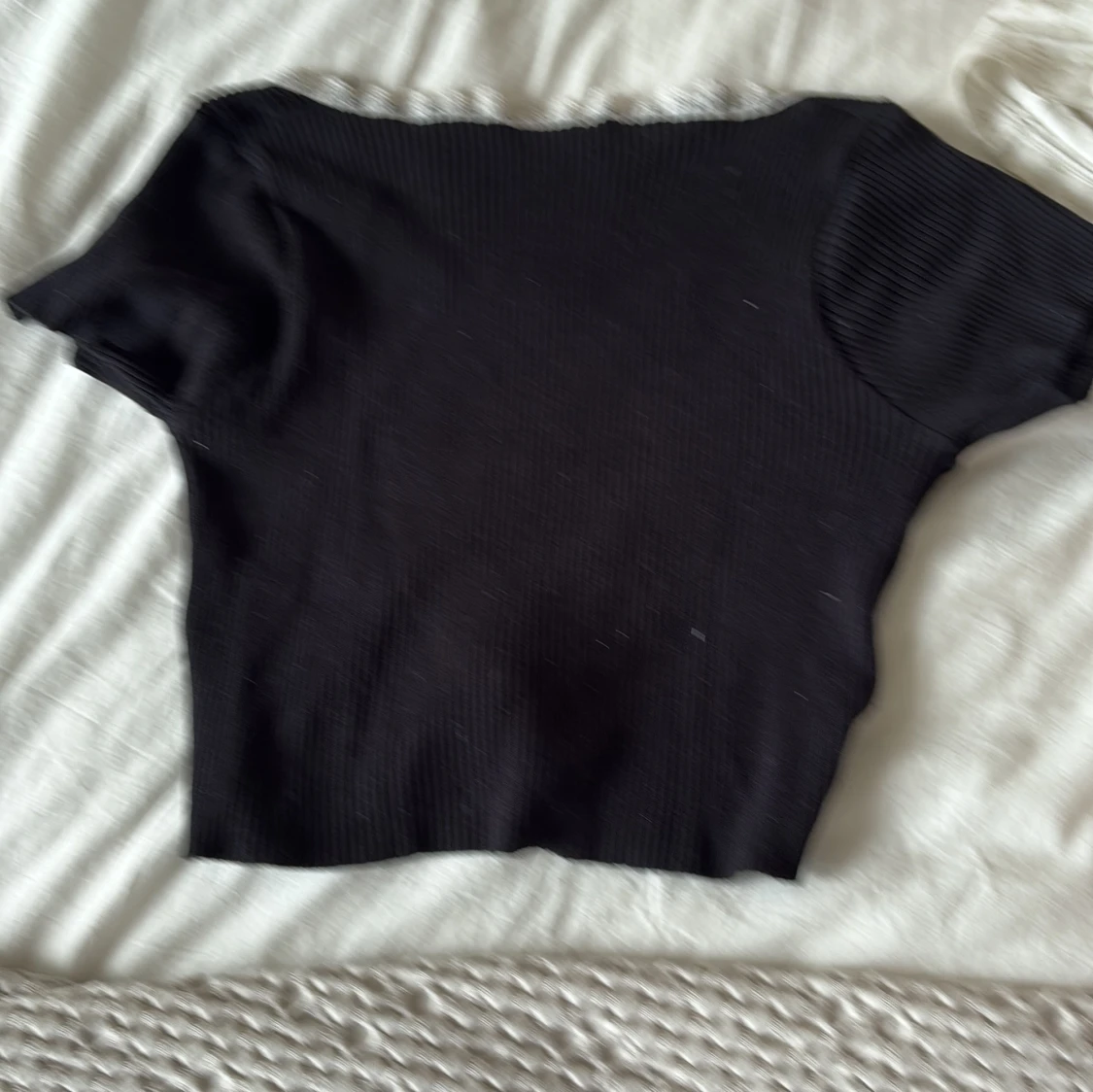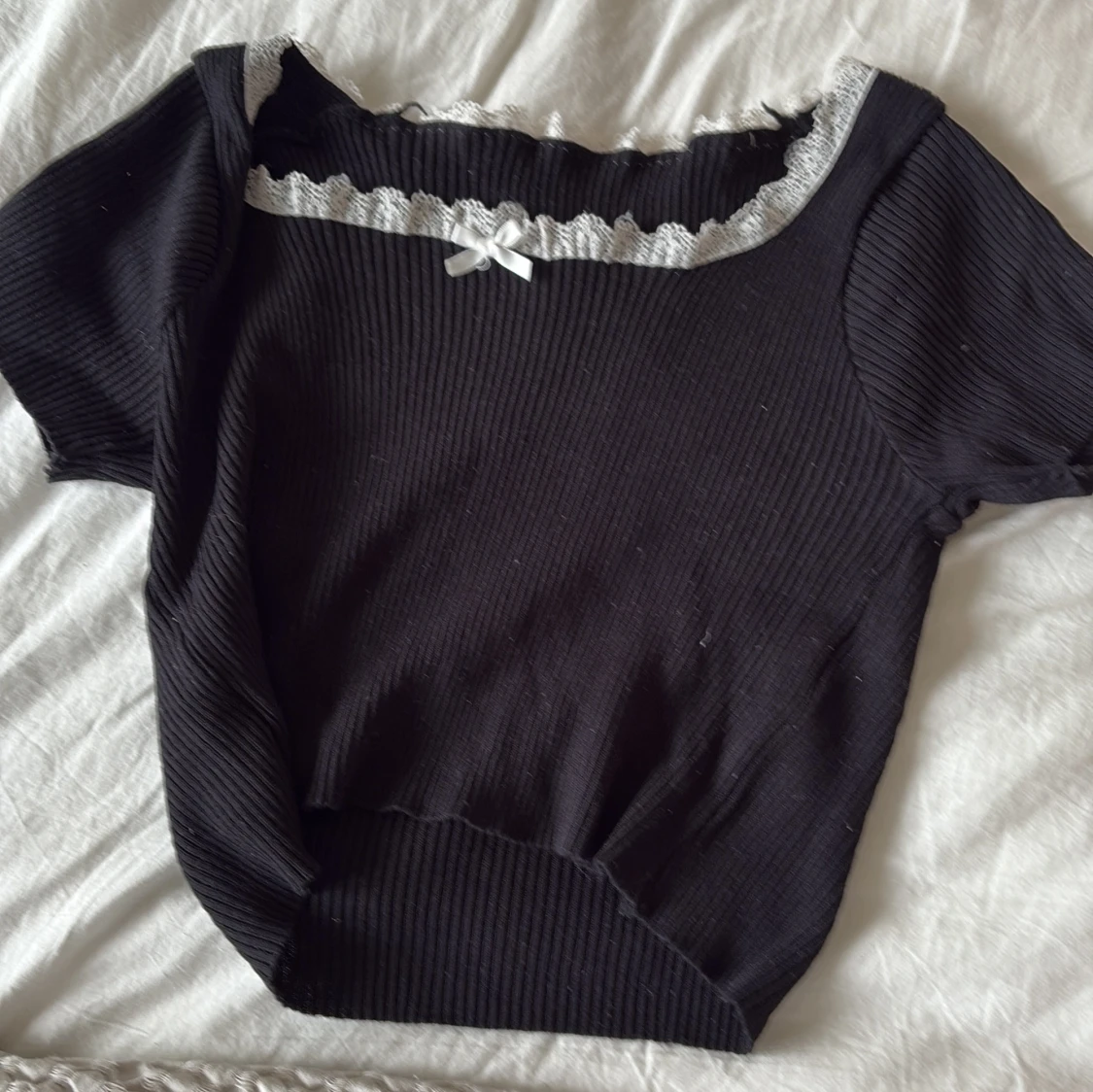 Supersöt svart ribbad topp med korta ärmar, vit spetskant och en liten rosett framtill. Toppen har en croppad passform och är perfekt för dig som gillar en gullig och trendig stil. Materialet är stretchigt och bekvämt.