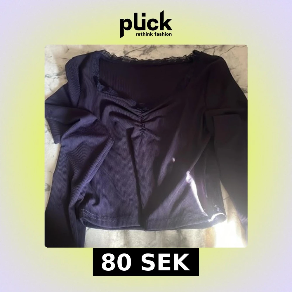 Säljer en mörklila ribbad långärmad topp med spetskantad v-ringning och liten rosett framtill. Toppen har en snygg rynkdetalj vid bysten och är figurnära i modellen. Perfekt för dig som gillar romantiska detaljer och mjuka material. Aldrig använd.