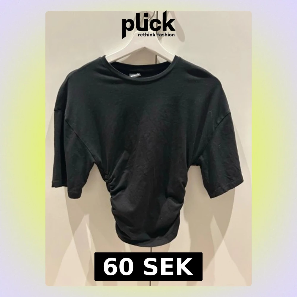 Trendig svart croppad topp med korta ärmar och snygg rynkdetalj i midjan. Perfekt till höga jeans eller kjol. Mjuk och skön i bomullsmaterial med avslappnad passform och rund halsringning.
