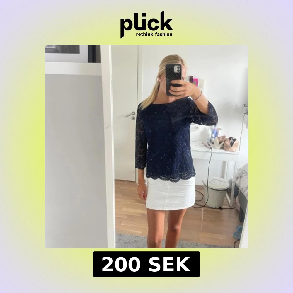 Säljer en mörkblå blus i spets med fina blommiga detaljer. Blusen har trekvartsärmar och rund halsringning. Den är lätt transparent i ärmarna och har en snygg vågig kant nertill. Perfekt för dig som vill ha en elegant och trendig look.