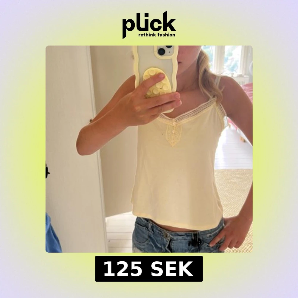 Supersöt ljusgul linnetopp från Women'secret med tunna axelband och fina spetsdetaljer längs ringningen. Dekorativa knappar framtill och mjukt material som känns skönt mot huden. Perfekt för varma dagar eller som layering-piece.