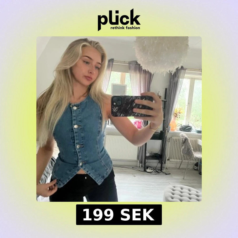 Säljer en snygg ärmlös korsettopp i blå denim med markerad midja och cool knappstängning framtill. Toppen har en unik skärning nertill och sitter tight för en riktigt trendig look. Perfekt att styla med svarta jeans eller kjol.