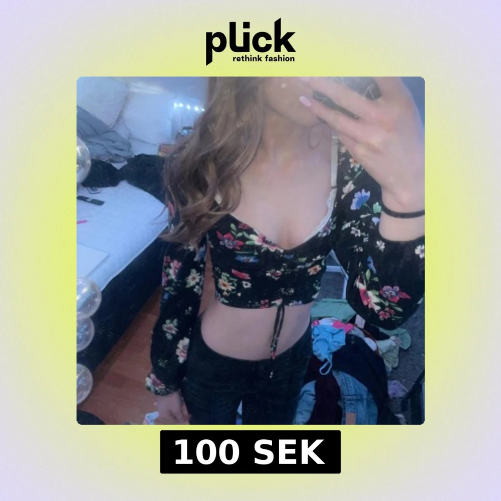 Säljer en snygg svart croppad topp från H&M med blommigt mönster i olika färger. Toppen har långa ärmar och en knytning framtill som ger en fin detalj. Perfekt för att liva upp garderoben!