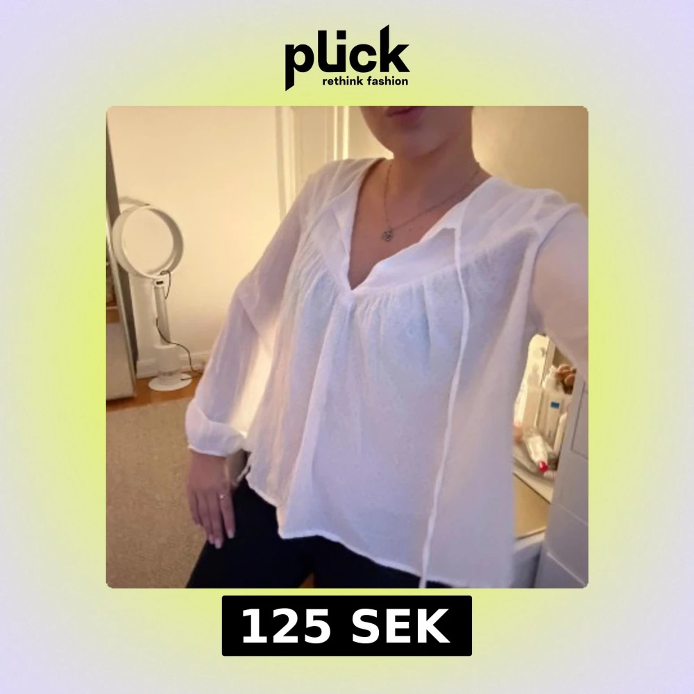 Säljer en luftig vit blus med v-ringning och tunna knytband framtill. Blusen har långa ärmar med resår vid handlederna och är tillverkad i ett lätt, transparent tyg som ger en avslappnad och trendig look.
