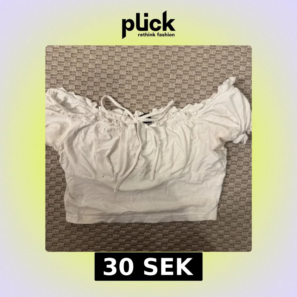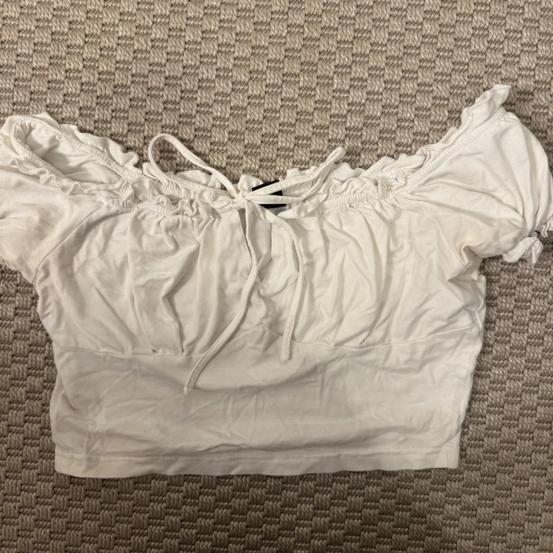 Säljer en vit magtröja croppad blus med offshoulder och snörning framtill. Toppen har volangdetaljer längs halsringningen och är tillverkad i mjuk bomull. Perfekt för dig som gillar romantisk och feminin stil.