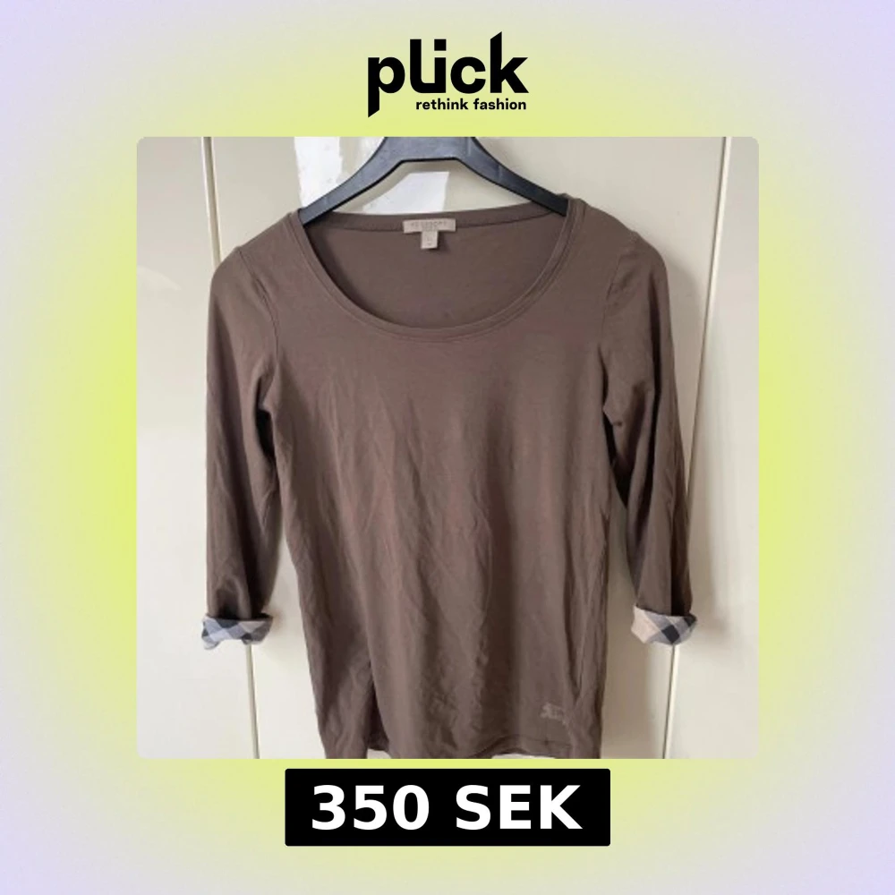 Snygg brun långärmad topp från Burberry Brit i mjuk bomull. Ärmarna har klassiskt rutigt tyg på insidan som syns när du viker upp dem. Rund halsringning och diskret Burberry-logga nertill. Passar även en small.